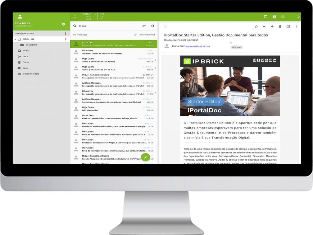 O IPBRICK.MAIL assegura-lhe o acesso seguro e uma gestão eficaz da sua conta de e-mail, bem como dos contactos, calendários, tarefas e notas.