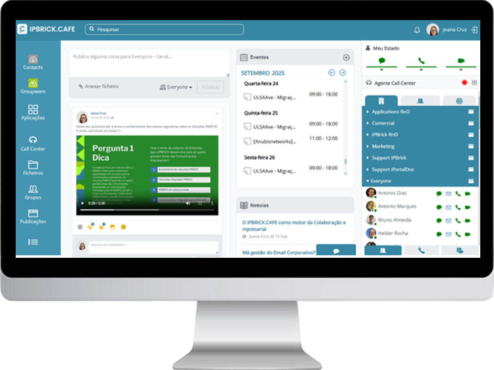 O IPBRICK.CAFE integra com as Comunicações Unificadas (voz, videoconferência, e-mail e chat profissional) e é a porta de acesso para todas as aplicações IPBRICK.
